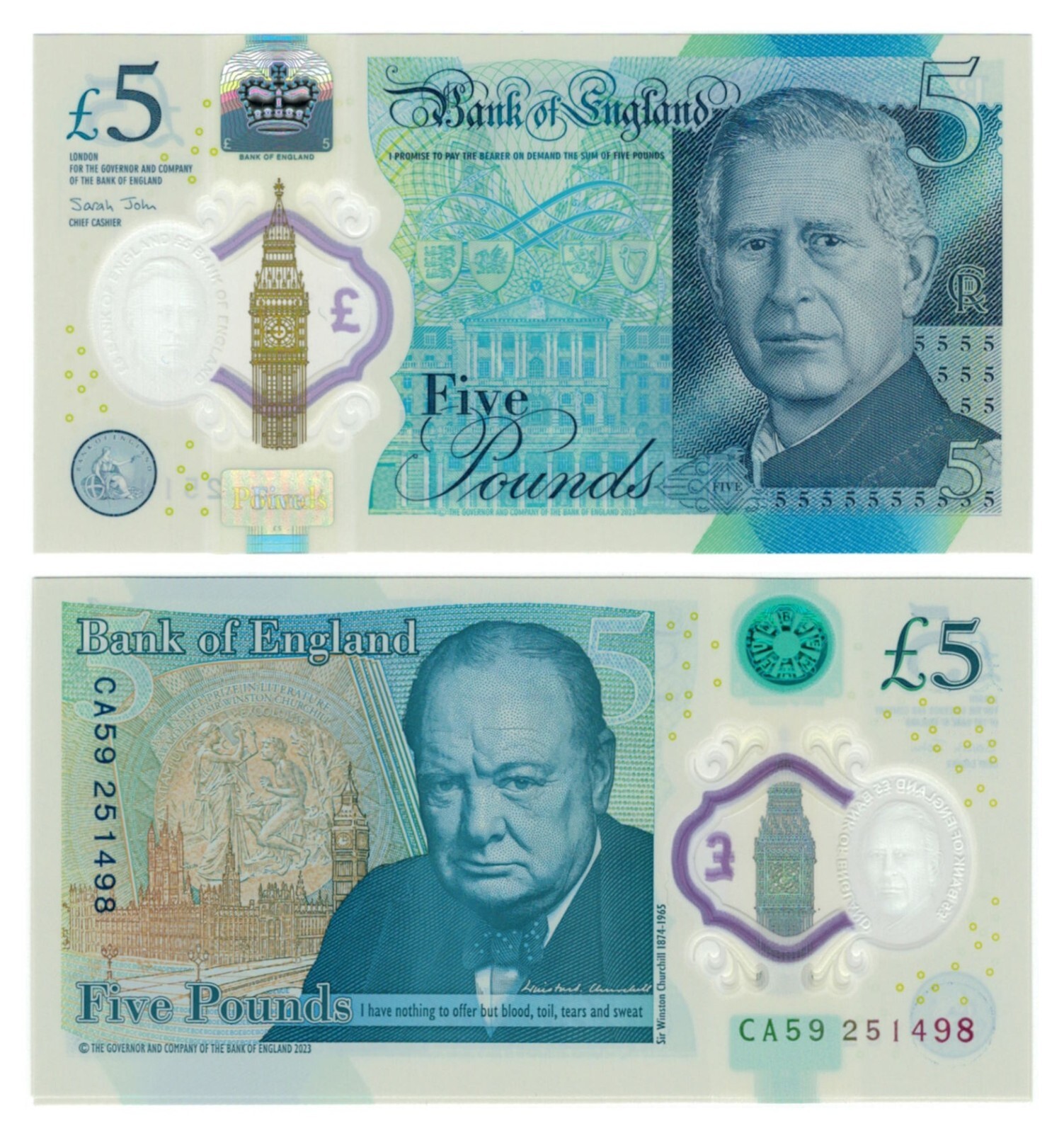 The new £5 GBP banknote is the smallest-denomination polymer note issued by the Bank of England. It combines durability, advanced security, and cultural significance. The latest edition features King Charles III on the front, marking the first circulation of the monarch’s portrait on UK banknotes, while continuing to celebrate British history and heritage on the reverse.